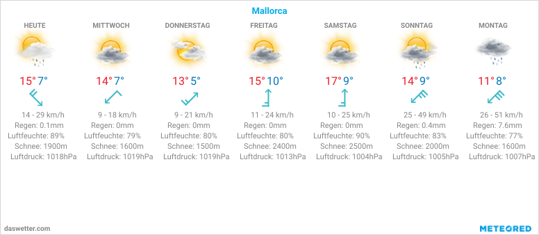 Wie ist das Wetter auf Mallorca? Die aktuelle Wetterlage der Baleareninsel mit der Vorschau für die nächsten 6 Tage. Wird täglich auf den neusten Stand gebracht.